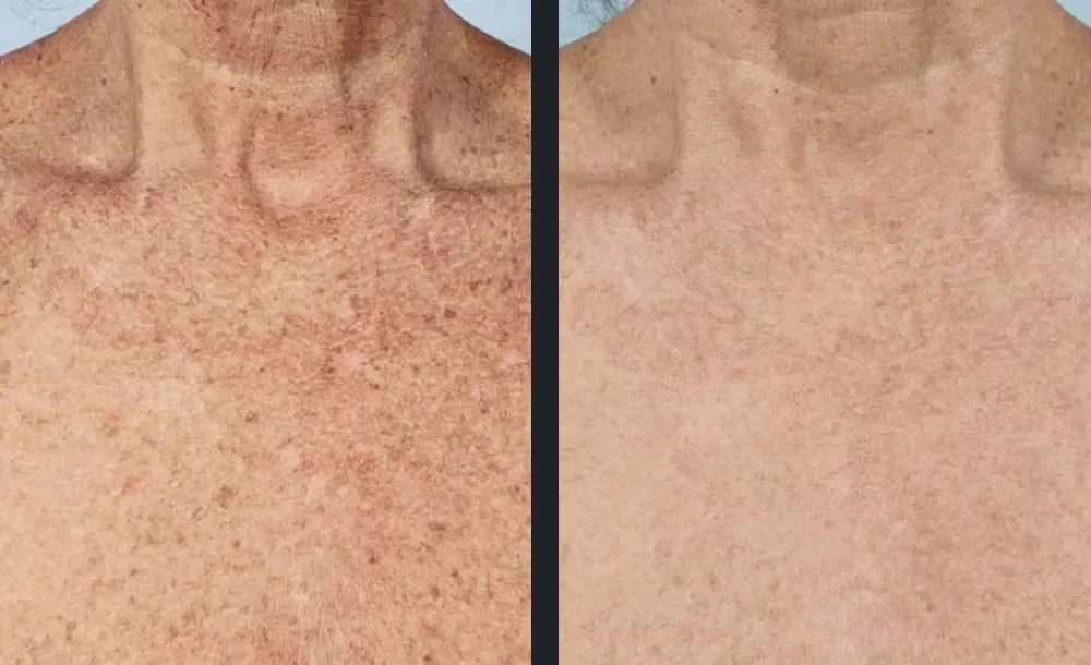 Flat, darkened spots caused by years of sun exposure, often appearing on the face, chest, or hands.How we treat it: